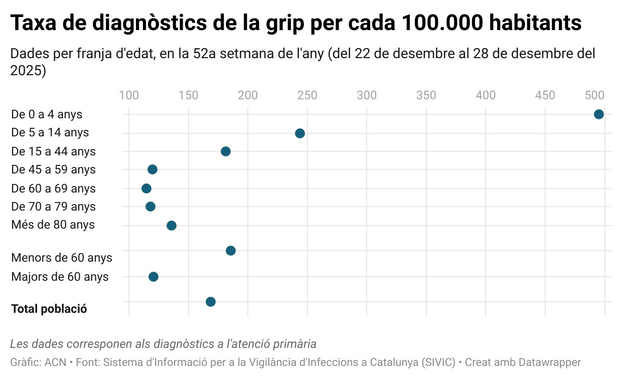 Dels 13.692 casos diagnosticats a l’atenció primària, 11.130 són de menors de 60 anys. Els infants continuen tenint les taxes més elevades de grip.