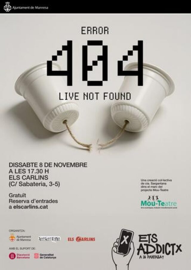El projecte MOU-TEatre presenta el proper dissabte 8 de novembre a les 17.30 h a la sala Els Carlins la seva nova obra titulada “Error 404 Live not found”. Aquesta creació col·lectiva pretén fomentar una reflexió crítica sobre l’ús de les pantalles en la vida quotidiana.